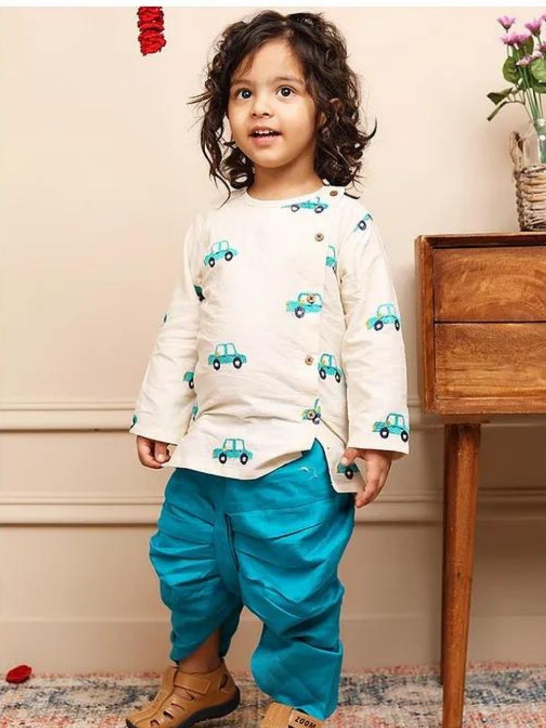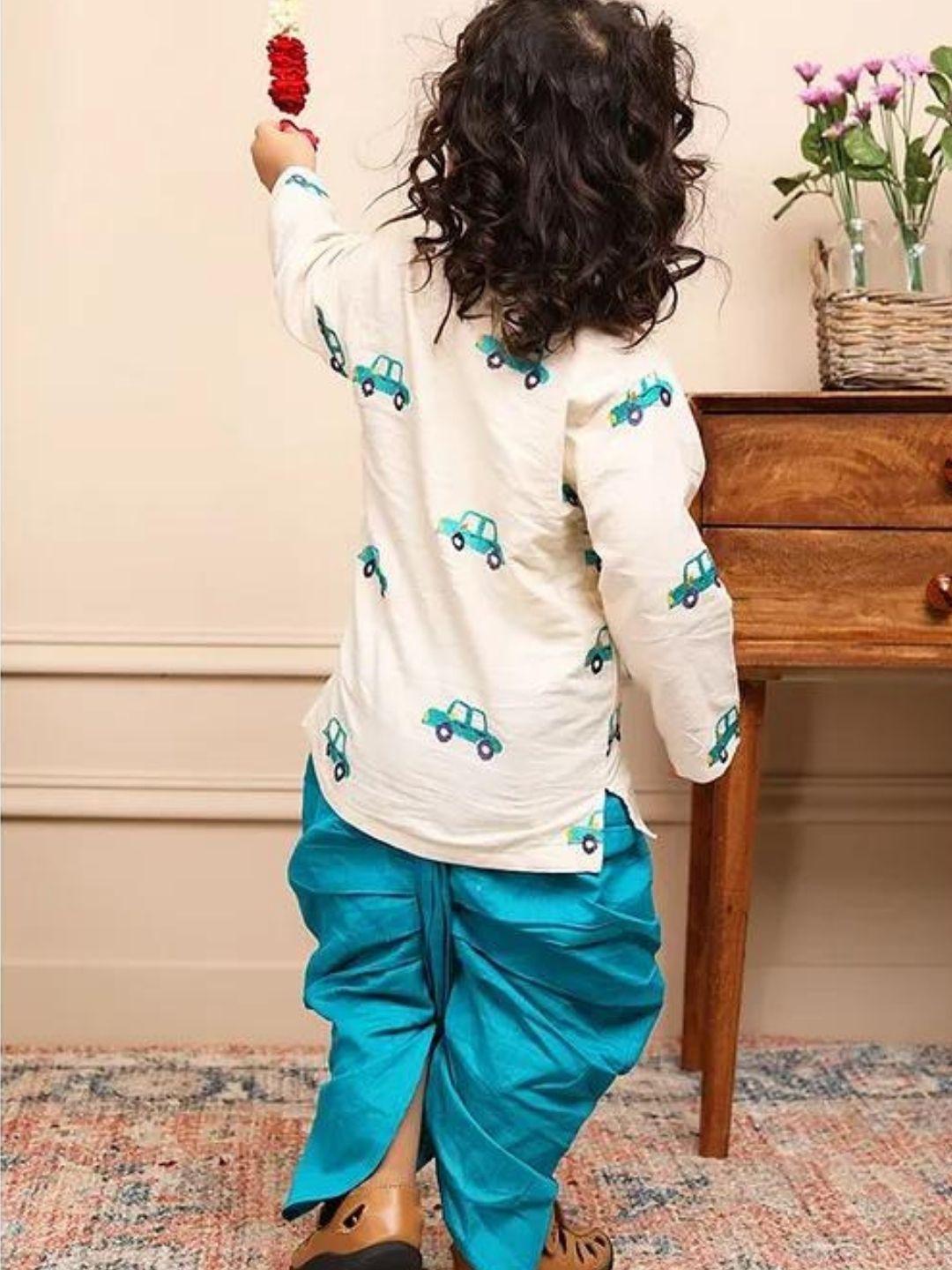 Full Sleeves Car Embroidered Kurta With Dhoti - Blue And Cream