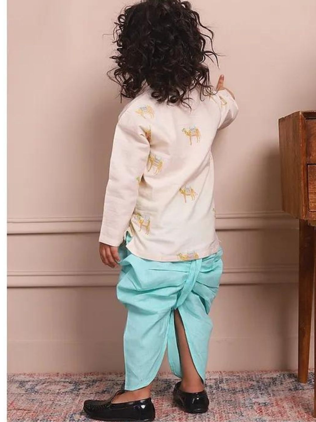 Cream and Blue Camel Embroidered Kurta With Dhoti