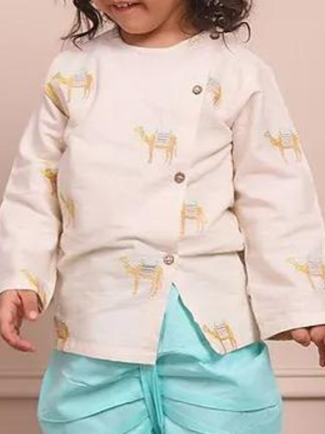 Full Sleeves Camel Embroidered Kurta With Dhoti - Cream