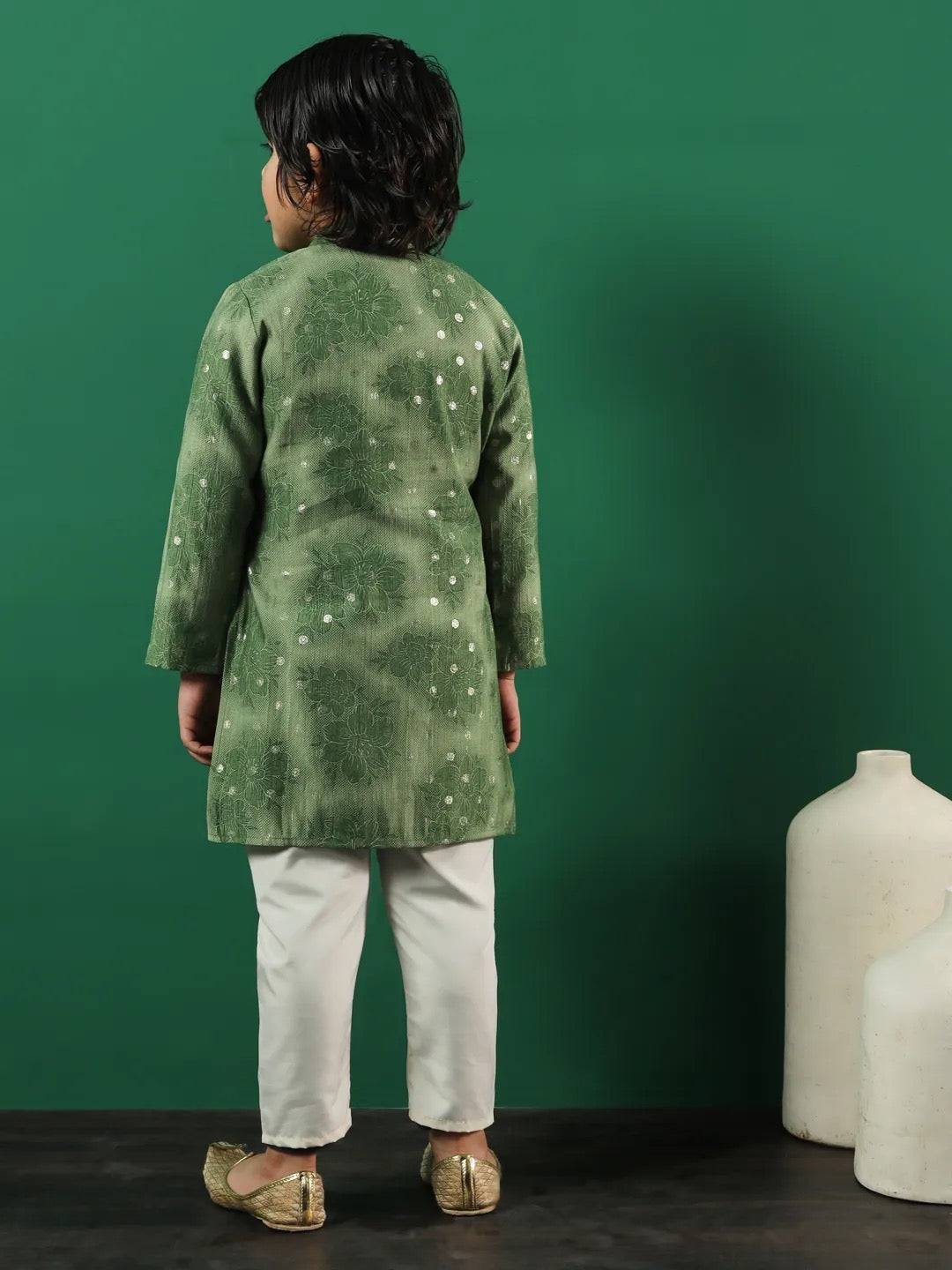 Straight Style Silk Fabric Floral Printed Kurta And Pyjama - Olive Green