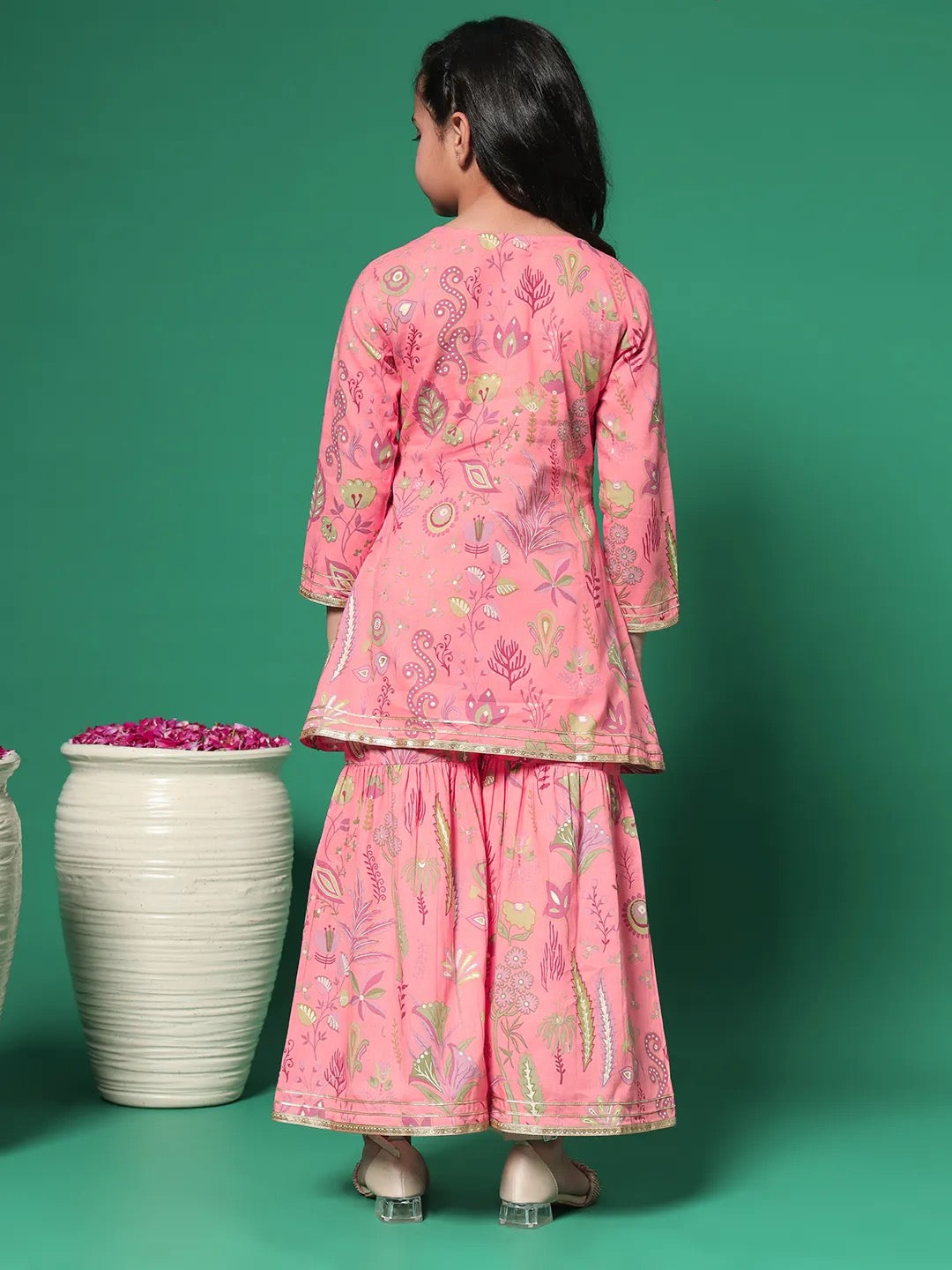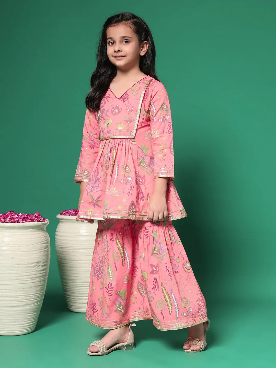 A Line Style Cotton Fabric Peach Color Kurti With Sharara