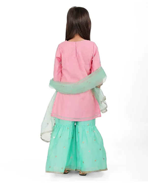 Pink & Blue - Kurti Gharara & Net Dupatta Set