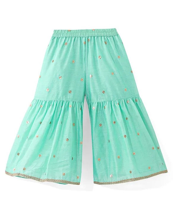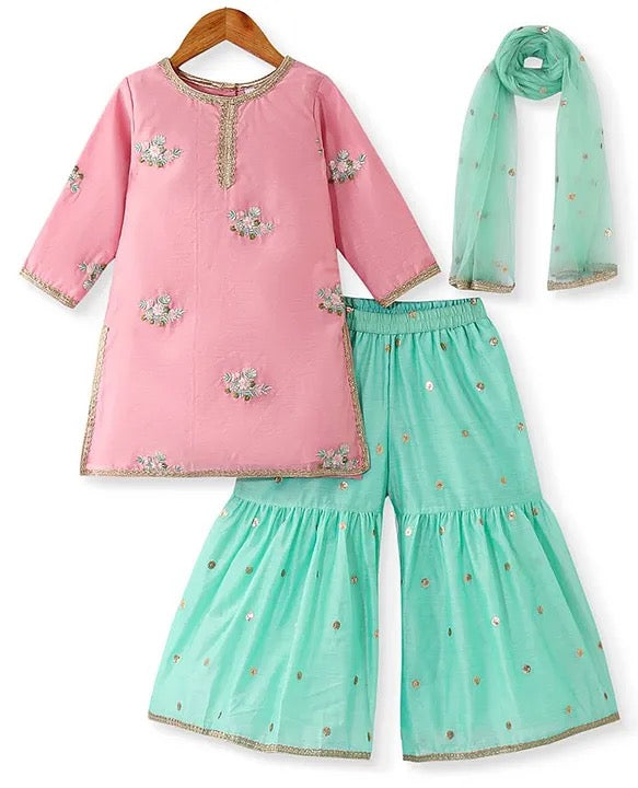 Woven Full Sleeves Sequinned Chanderi Floral Embroidered Kurti Gharara & Net Dupatta Set - Pink & Blue