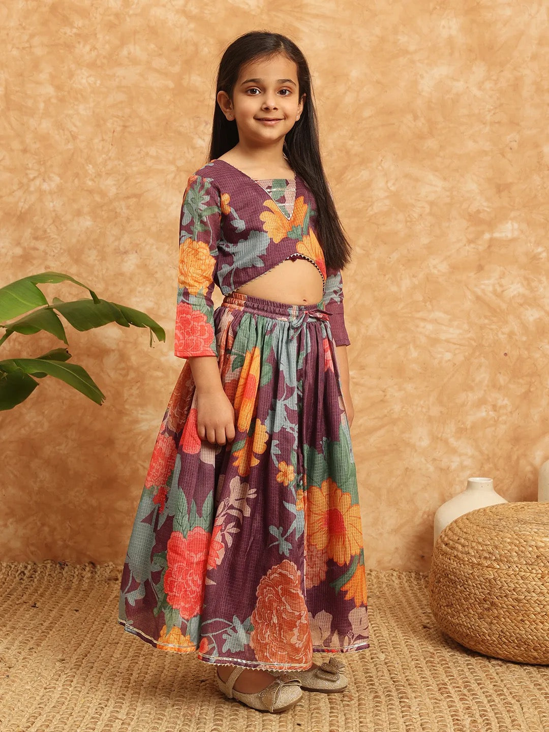 Straight Style Kota Doria Fabric Purple Color Printed Lehenga Choli